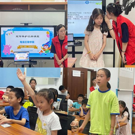 “江豚有圆圆的肚子、光滑的皮肤、弯弯的嘴角”“江豚的平均体重大约是60千克”“江豚是一种保护动物”在“守护长江精灵的微笑”科普宣讲现场,孩子们争先恐后地向志愿者描述自己了解的江豚。为了提高人们对江豚保护的认识、增强环保意识,志愿服务队走进金地格林东郡社区,开展了形式多样的科普宣讲活动。在江豚科普课堂上,志愿者用生动活泼的语言和丰富精彩的图片、视频向小朋友们介绍了江豚的外形、生活习性、生存状况等基本情况;在交流互动环节,志愿者通过知识问答、小游戏等形式,寓教于乐,进一步巩固了小朋友们对江豚知识的了解,更激发了他们对江豚保护的热情和责任感,为他们播下了一颗守护青山绿水的种子。