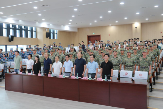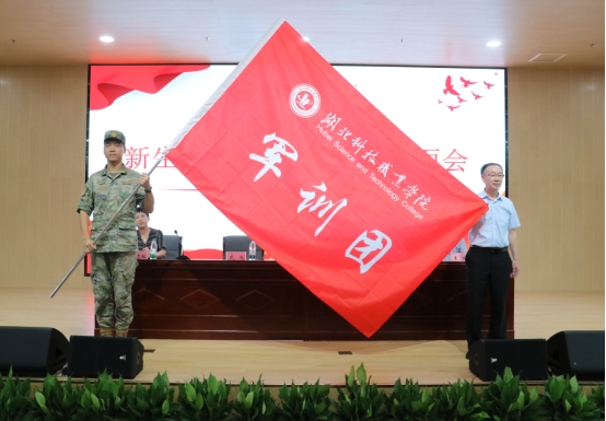李宜兵代表学校将2024级军训团旗授予空军武汉基地军训团团长武旭。武旭代表全体教官郑重承诺:“我们将以良好形象、过硬素质、严谨作风,全力以赴完成军训任务,助力新生成长。”