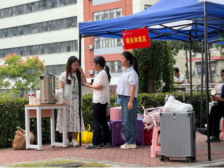 艺术创意学院把非遗漆扇搬到迎新现场,新生可以亲手制作属于自己的独一无二的漆扇。新生们对这一传统文化技艺充满兴趣,不仅欣赏到书法艺术与漆扇制作的完美融合,还收获了自己亲手制作的独一无二的漆扇。这边热闹,家长休息区却有“一份清凉”。在家长休息区学院特别供应夏日特饮酸梅汤,炎炎夏日为远道而来的家长送去一份凉爽。