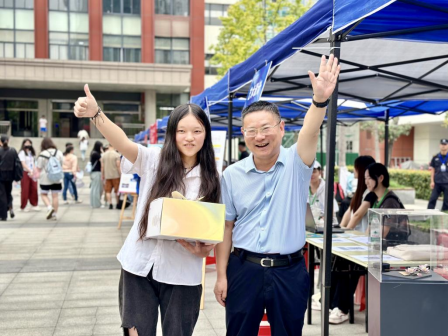恰逢一位新生在开学当天过生日,学院为这位幸运儿送上了一份特别的祝福。精心准备的生日蛋糕由何平亲自送到这位新生手中,为她的大学生活开启一个难忘的序章。艺创学子以二十四节气、黄鹤楼文化等中华优秀传统文化为依托,融入现代设计元素和理念,设计了3种团扇送给新生及家长。艺术创意学院特色文创产品设计精美、实用性强,让新同学们不仅感受到了学院的文化底蕴,也感受到了文化创新与传承的无限可能。