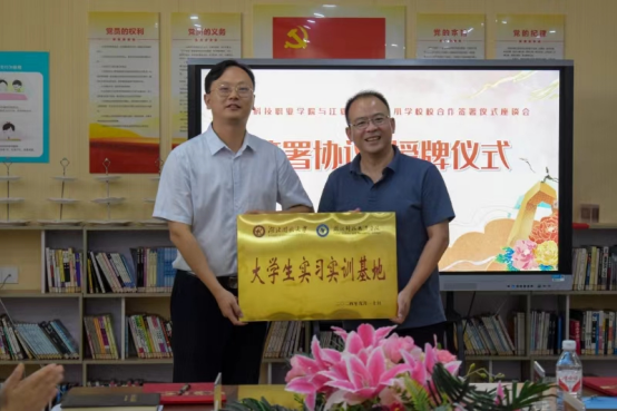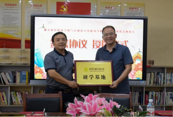 签约仪式上,双方签署校校合作协议,我校授予江夏区大花岭小学“大学生实习实训基地”,大花岭小学授予我校“研学基地”。