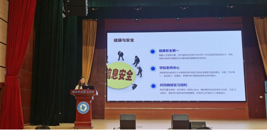 实习动员会结束后,学院召开毕业生岗位实习安全教育专题会议,通过案例从遵纪守法、食品卫生、交通安全、工作安全、居住安全、防抢防盗防骗、社会安全等方面讲授实习安全课。希望同学们尽快适应实习单位的岗位要求和企业文化,以饱满的热情和良好的精神面貌迎接实习,做到“高高兴兴实习去,铭记安全平安随”。
