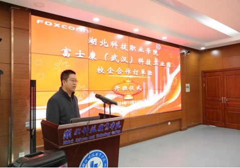 本网讯(通讯员 罗冲/文 李江星/图)为进一步深化校企合作,助力地方产业发展,培养高素质的实用型技能人才,为学生提供优质就业平台,10月31日上午,湖北科技职业学院·富士康(武汉)科技工业园校企合作订单班开班仪式顺利举行。机电工程学院领导班子、富士康(武汉)科技工业园相关领导以及订单班全体同学参加开班仪式。仪式由谭闺臣老师主持。