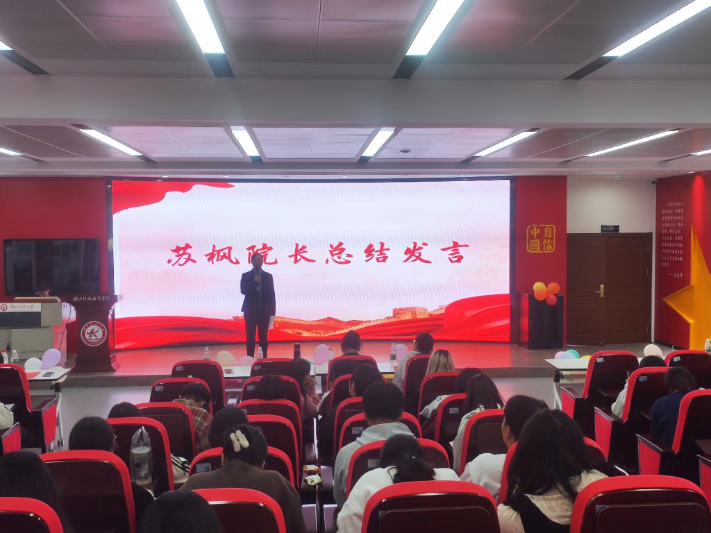 院长苏枫作总结讲话,她表示本次大赛为学生提供了展示平台,传承了红色精神,加强了思政教育,意义重大。希望同学们肩负使命,以红色精神为指引,为旅游事业发展贡献力量。