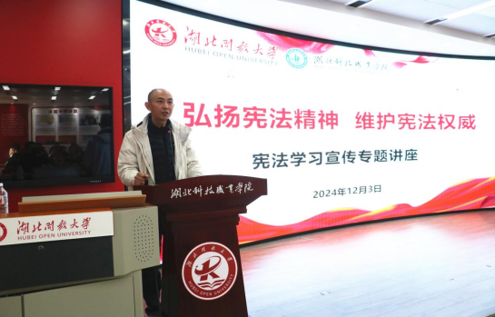 本网讯(通讯员 李贺刚 文/图)12月3日,在第十一个国家宪法日即将来临之际,为增强全校师生的法治观念,让宪法精神深入人心,我校举办宪法学习宣传专题讲座。讲座邀请湖北得伟君尚律师事务所合伙人律师、学校法律顾问黄克宗担任主讲嘉宾,全校近200名师生代表参加讲座,讲座由党委宣传部常务副部长郝锐主持。