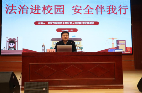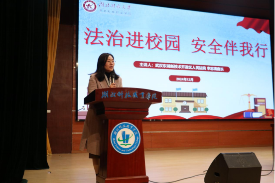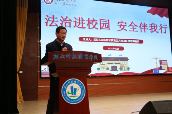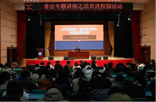 本网讯(通讯员 俞运龙/文 李贺刚/图)为加强对青年学生的法治安全教育,提升大学生预防诈骗能力,增强安全防范意识和自我保护能力,12月10日,我校特邀武汉东湖新技术开发区人民法院东湖人民法庭庭长李志涛为全校近300名师生开展了普法宣传之法官进校园专题讲座,讲座由机电工程学院党总支书记赵清泉主持。