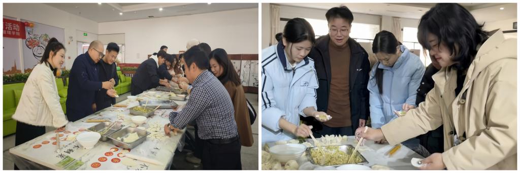下午3点,师生们在活动场地开始忙碌起来。面团在手下逐渐延展,擀成一张张中间稍厚、边缘稍薄的饺子皮,再将和好的肉馅包入,小巧精致的饺子便呈现在眼前。经过一个多小时的努力,有宛如新月的月牙饺,有饱满圆润的元宝饺,甚至还有圆圆胖胖的小包子,场面一片欢腾。在创意拼盘环节,大家涌现出一个个美观又巧思的作品,如“冬至”“快乐”“12·18”等;在冬至谚语比拼环节,大家积极参与,彰显出对传统文化的了解与传承,师生感情也在手工与协作中交融。