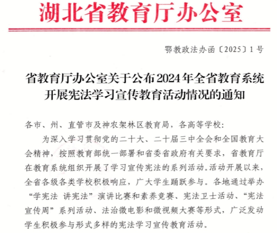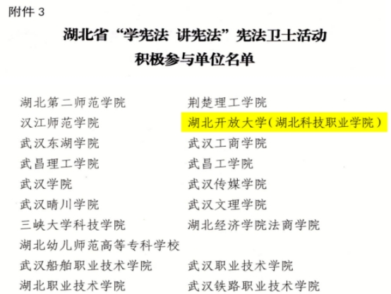 本网讯(通讯员 李贺刚 文/图)近日,湖北省教育厅办公室发文通报2024年全省教育系统开展宪法学习宣传教育活动情况,我校获湖北省“学宪法 讲宪法”宪法卫士活动积极参与单位称号。