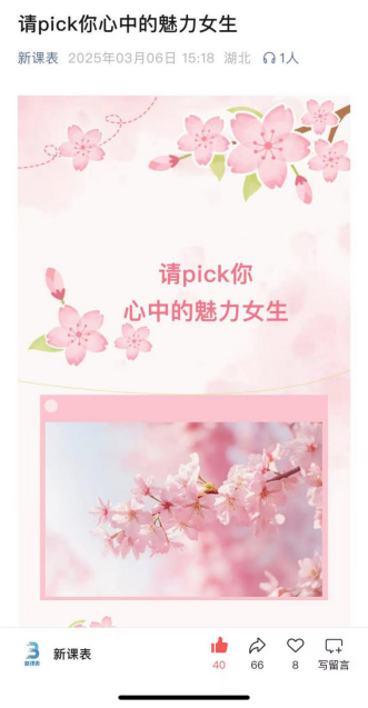 3月6日,学院在“新课表”微信公众号开展了“软院魅力女生评选”活动。同学们积极参与,通过照片、视频结合文字介绍积极进行自我风采展示。参选女生或成绩优秀,或特长突出,或工作能力优秀,大家百花竞艳、各有千秋,从不同方面展示了学院女孩“自信、自立、自强”的意识和积极向上的精神风貌。评选期间,共计1.2万人次学生参与本次投票,积极为自己心中的魅力女生投票,经过四天的评选,三位女生脱颖而出,并获得丰富的活动奖品。