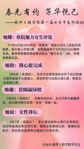 本网讯(通讯员 汪翩 邹世康/文 吴豫/图)为展现女生风采、传递互助精神、凝聚成长力量,3月3日至9日,软件工程学院以“春光有约 芳华悦己”为主题,举办了女生节系列活动。活动通过“她耀、她助、她趣、她叙”四大主题,让女生们在春光中悦纳自我,绽放光彩。