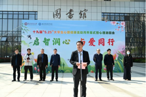 本网讯(通讯员 王钰/文 大学生记者:蔡迪嘉恒、张乃允/图)3月20日,以“启智润心,与爱同行”为主题第十九届“5.25”大学生心理健康活动月开幕式暨心理游园会在关山校区北广场举行。副校长周得力,学工部(处)、团委、后勤服务中心主要负责人,各学院党总支书记、学工办主任、全体辅导员及学生代表参加本次开幕式。学工部部长白杰主持开幕式。