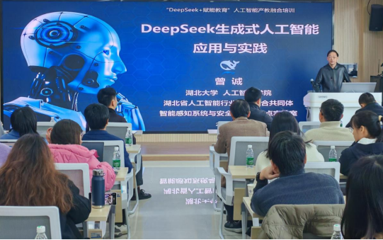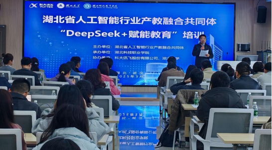 本网讯(通讯员 李春风 文/图)3月19日,湖北省人工智能行业产教融合共同体主办的“DeepSeek+赋能教育”专题培训在我校综合实训楼举行,副校长夏学文教授参会并致辞,湖北大学人工智能学院副院长曾诚教授、科大讯飞智能硬件实验室总监李奎、虚拟仿真实验室总监夏明峰、我校人工智能技术应用专业负责人伍辉教授依次报告,共同体成员单位70余名教师参加培训。会议由人工智能学院院长涂家海主持。