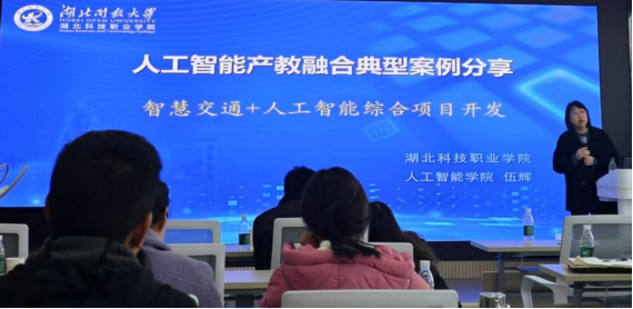 伍辉以“人工智能产教融合典型案例分享”为题开展简短分享。她结合我校“人工智能+创新实践基地”的案例,详细解读了产教融合模式的实际落地路径,并展示了实训室建设、智能交通项目开发、数字教材编纂等成果。