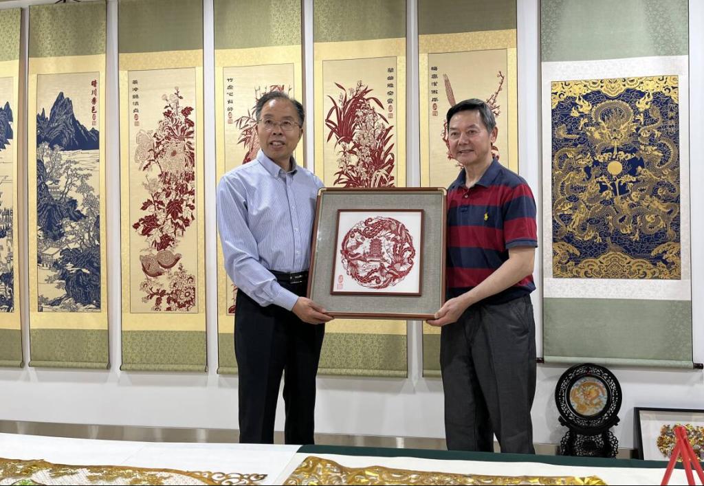 在交流会上,双方围绕非遗文化传承、文旅产业市场现状及非遗人才培养展开深度探讨。学校美育教研室负责人介绍了学校在非遗保护与传承中的实践成果,并在“打造非遗教学团队”“剪纸技艺的跨界融合”“非遗文化市场化”等方面提出校企合作新思路。