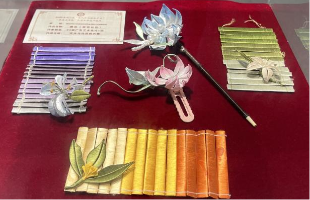 三楼展厅的双主题展览更彰显学术深度与创新高度。“楚风遗韵・布贴丹青”展中,《云染》《国色芳华》系列植物染作品以天地为纸,用天然染料绘就云卷云舒,晕染出层次丰富的色彩和纹理,展现出自然之美;在“非遗正青春”大学生作品展区,《楚简丝韵》《铃兰》缠花胸针以楚简、植物、花卉为灵感,将金丝银线编织成可佩戴的文化密码。最引人注目的当数周玉媛老师的绒花力作《荆凤花韵》,这件耗时百日的艺术品,以精湛技艺塑造出栩栩如生的凤凰造型,灵动华美,每一根羽毛都彰显匠心,成为展厅一大亮点,彰显出非遗传承人的深厚功底。