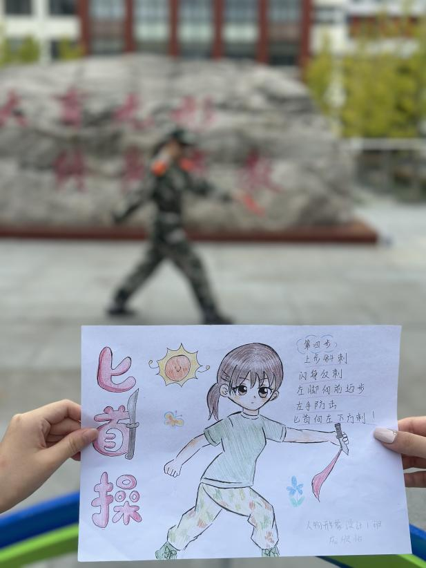 创意图说:艺术生的军训叙事。“光用眼睛记不够,我要把大家训练的样子画下来!” 为了让军训记忆更鲜活,学院发起的 “图说军训” 活动,成了艺创学子发挥专业特长的 “舞台”。他们拿起画笔、举起相机、打开设计软件,以独特的艺术视角,记录下匕首操训练中的每一个精彩瞬间。25级艺术设计专业陈同学的速写本上,将匕首操的标准动作拆解成手绘插画,标注动作要领,既美观又实用,成了训练场上的“小教具”。