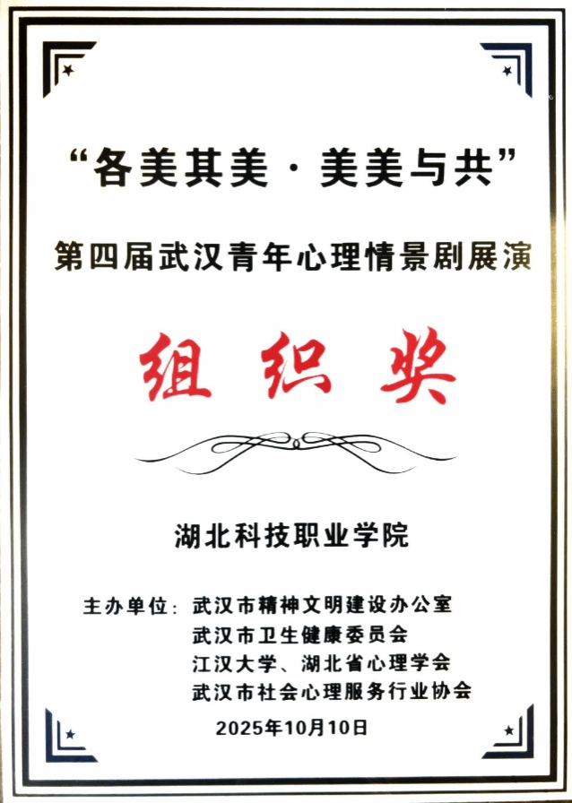 本网讯(通讯员 王钰 文/图)10月10日,第四届武汉青年心理情景剧展演活动闭幕式在江汉大学举行,我校原创心理情景剧《小满,未满》经网络展演、师生投票、专家评审,获评第四届武汉青年心理情景剧展演“组织奖”。