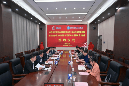 本网讯(通讯员 兰怡盈/文 徐敏 大学生记者:蔡迪嘉恒 田向阳/图)为深化产教融合、推进校企协同育人,湖北科技职业学院与中石化江汉石油工程有限公司于10月17日上午在学校8104会议室举行校企合作协议暨新型学徒制联合培养签约仪式。中石化江汉石油工程有限公司党委副书记陈常山、中国石化集团公司党组组织部高级主管党玉涵及中石化江汉石油工程有限公司党委组织部部长韩家新等一行六人,校党委常委、纪委书记、监察专员丁华涛,教务处、校企合作处领导,机电工程学院班子成员和教师代表参加仪式。