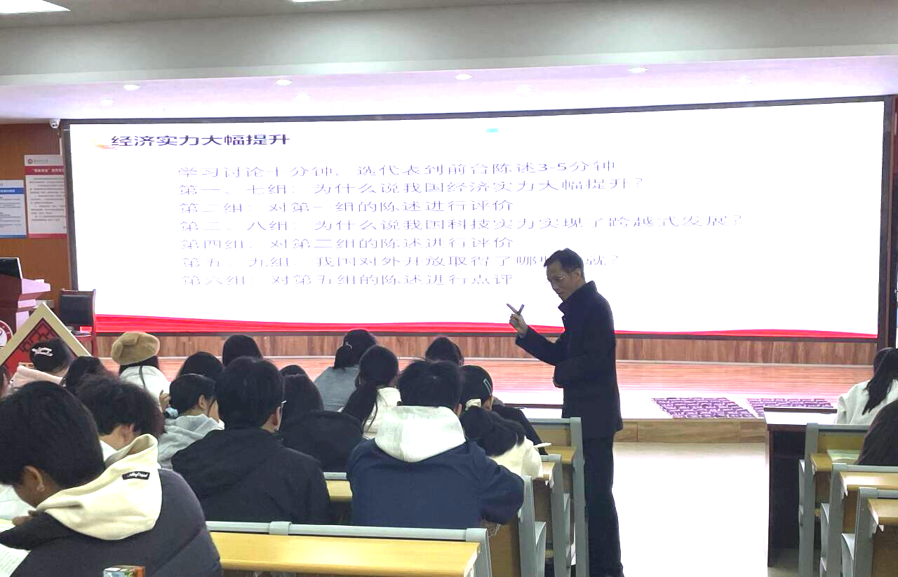 夏学文以一张张今昔对比图为切入,生动鲜活地讲述了七十五年来新中国在经济、政治、文化、社会等方面的沧桑巨变。“为什么说我国经济实力大幅提升?”“我国对外开放取得了哪些成就?”为什么我们最有理由说“文化自信”?课上,采用分组教学方式,以精心设计的问题为任务导向,小组成员分工协作,各抒己见,形成结论。期间,夏学文在各小组间巡视指导,适时答疑解惑并引导思考方向,指导每组代表展示了小组学习成果。